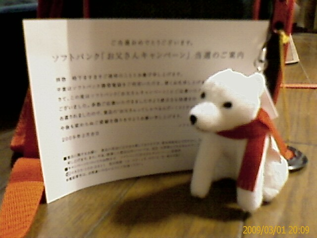 テレビCMでやってるのを、たったんが見て欲しい。って言ってたから どうすれば入手できるか調べていたら、ソフトバンクのHPで 新規契約以外でもOKで、抽選で当たるということもあり、 ダメ元で申し込んでいた。 そんなことすっかり忘れていたら、今日宅配が届いて中を開けて見たら、 お父さんが入っていた。 今まで、懸賞に当たることがあまりなかったので、すごくうれしかったが、 記念写真を撮る前に、たったんに取られて保育園のカバンに付けられた。 保育園でみんなに見せびらかしたいそうだが、またケンカとかになって 先生に怒られるかも・・・ まあ、いいや。 それよりも、宝くじ当たんないかな~ |